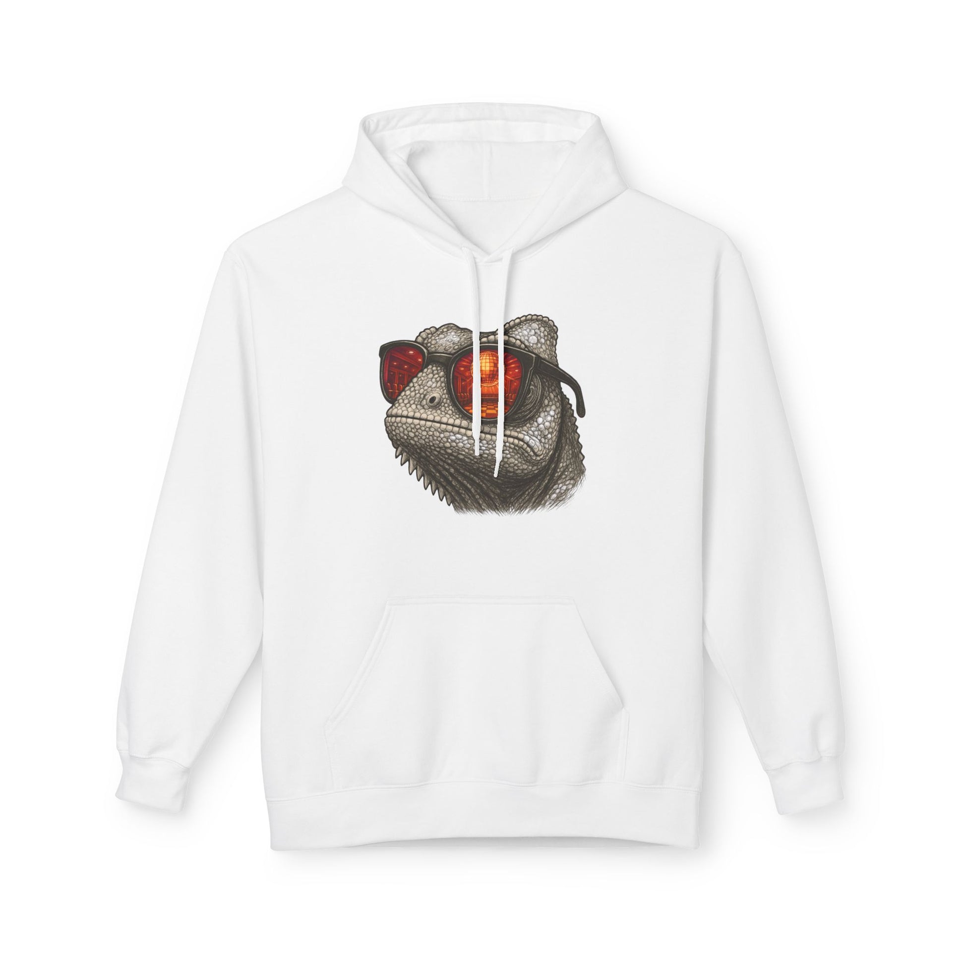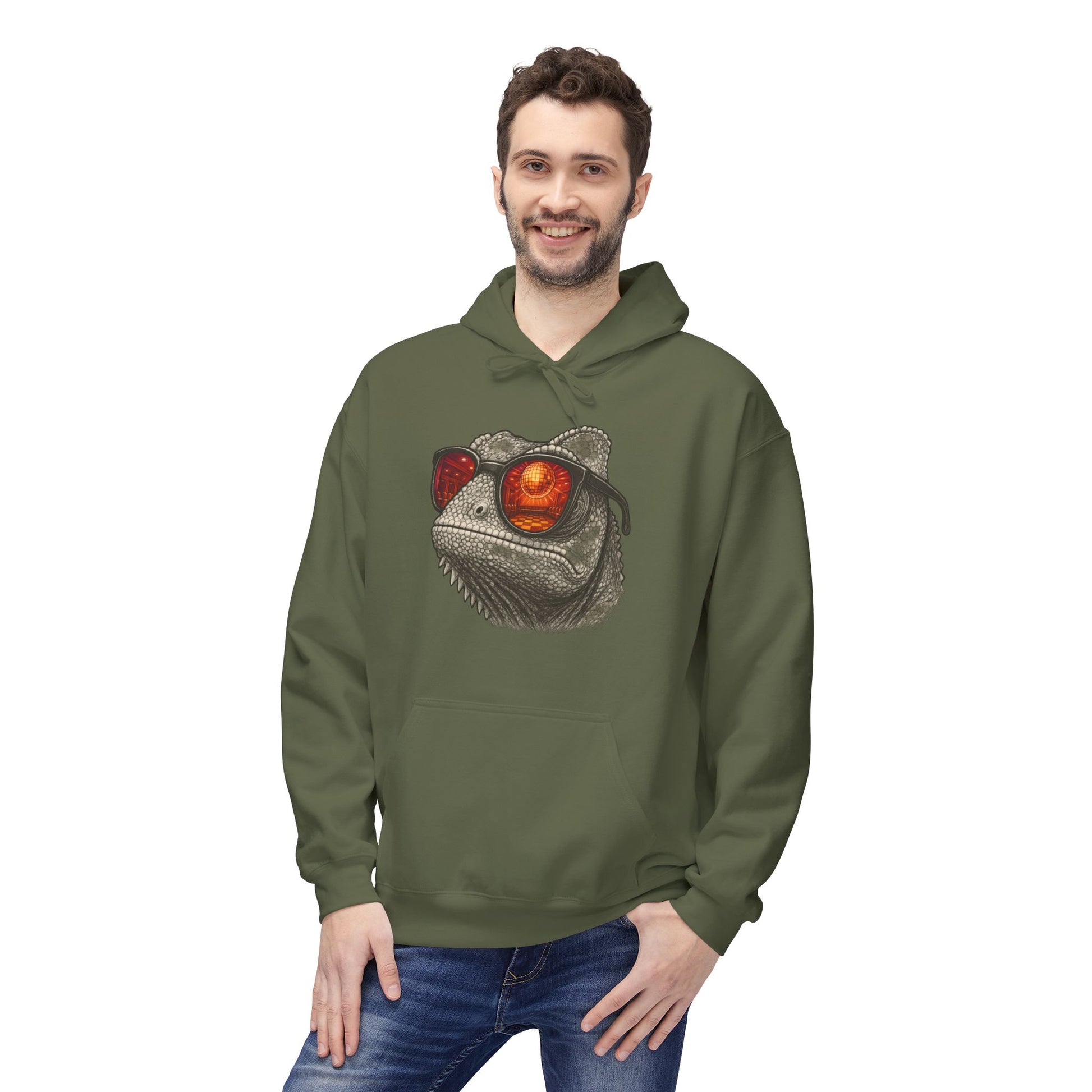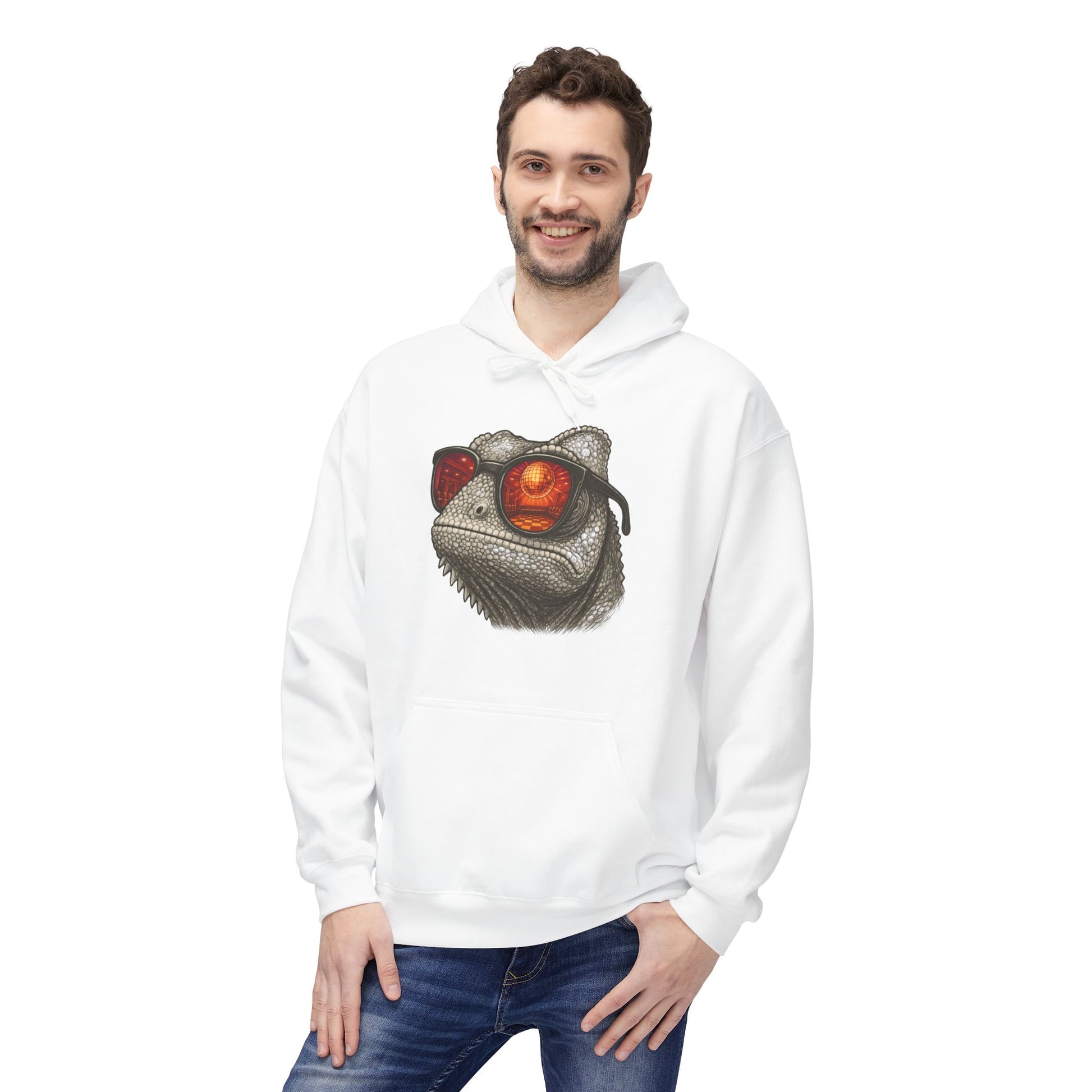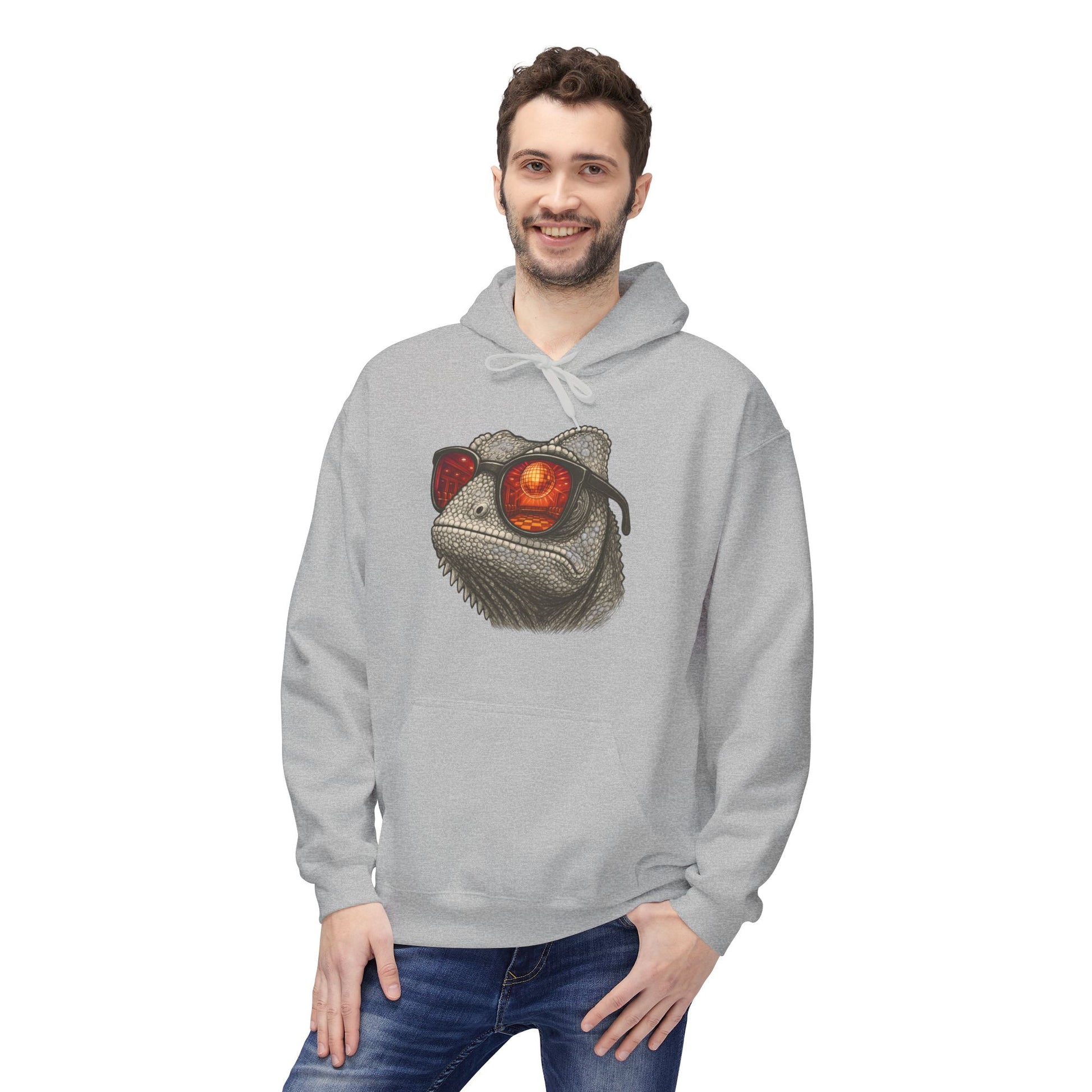 Chamäleon Hoodie Unisex (Brustprint) – Retro Tiermotiv mit Sonnenbrille & Disco-Design – Lustiger Kapuzenpullover für Festival, Streetwear & Geschenkideen