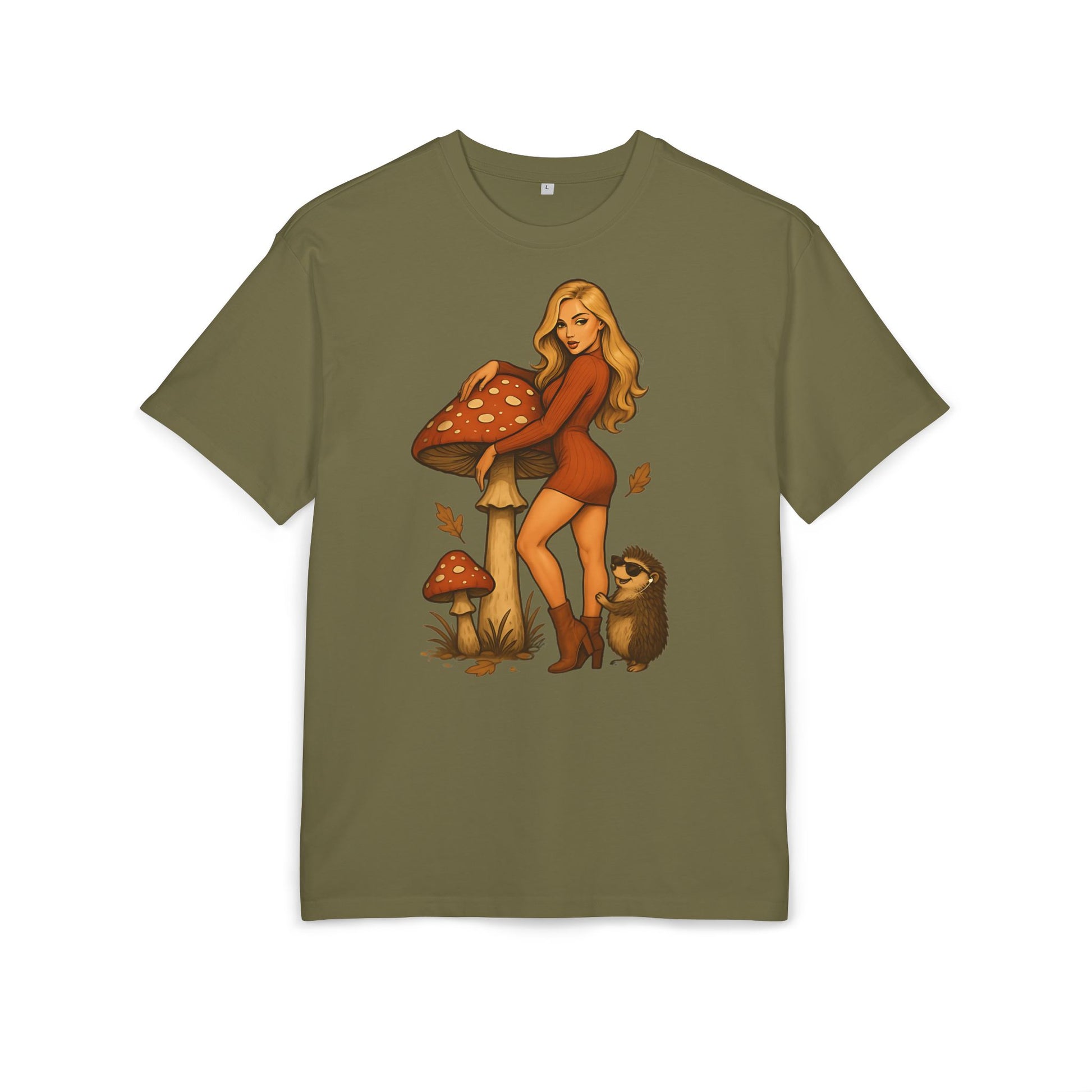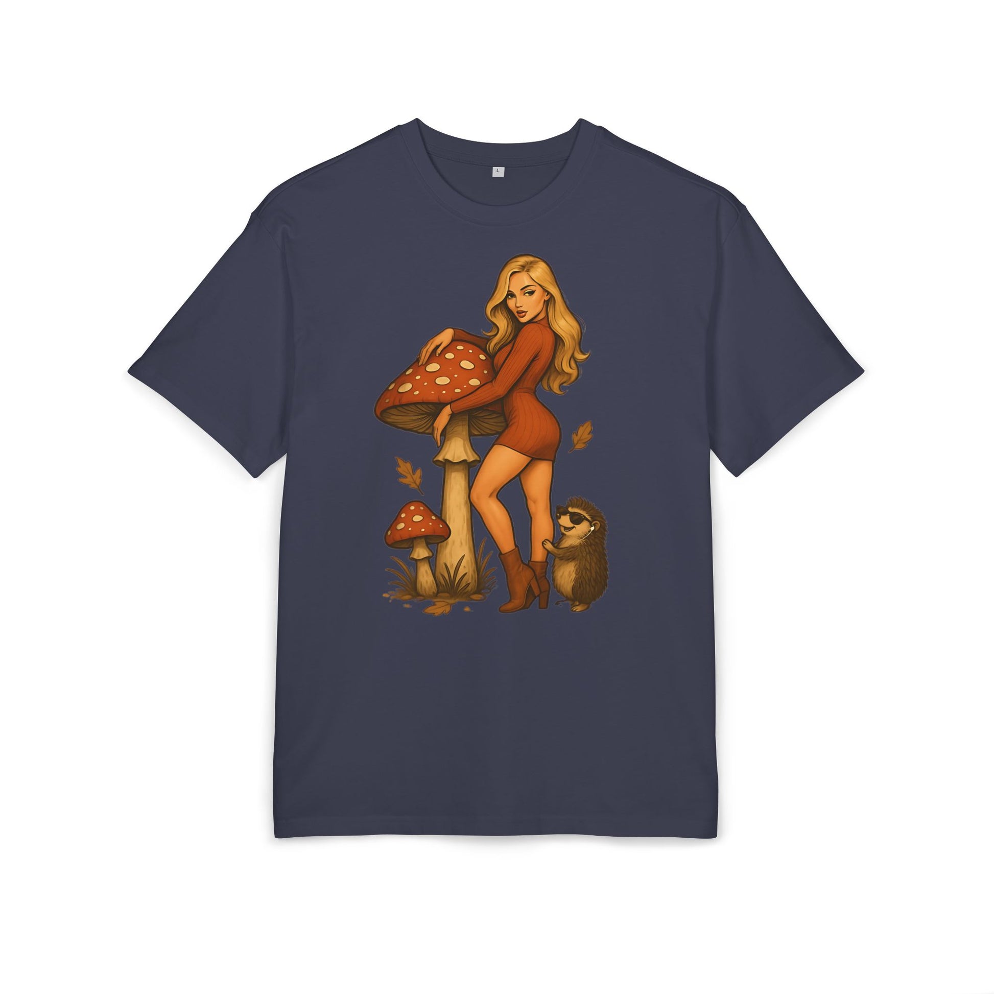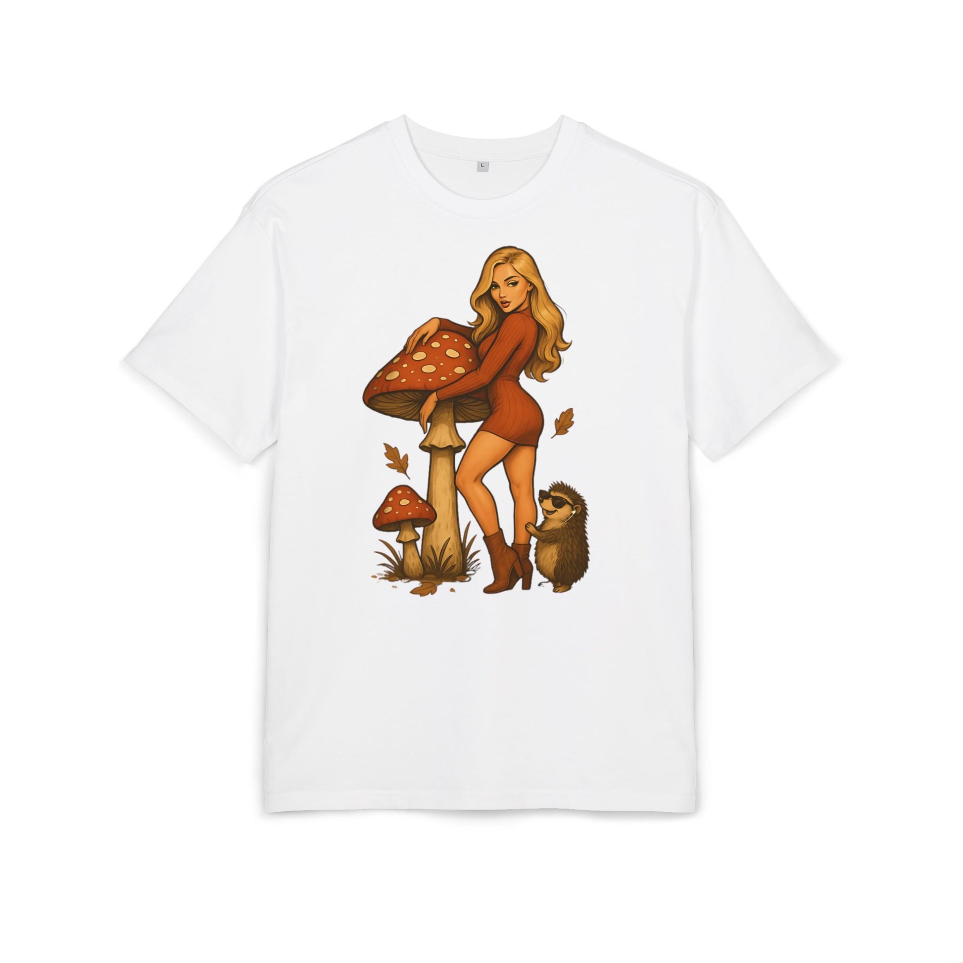 Vintage Pilz Fee & Igel Cartoon (Brustprint) – Retro Waldmotiv T-Shirt für Natur- & Pilzliebhaber