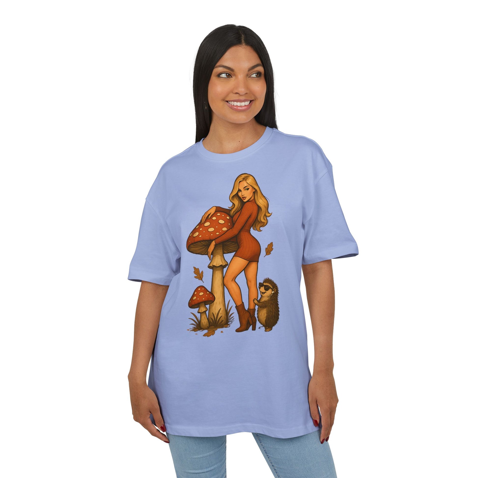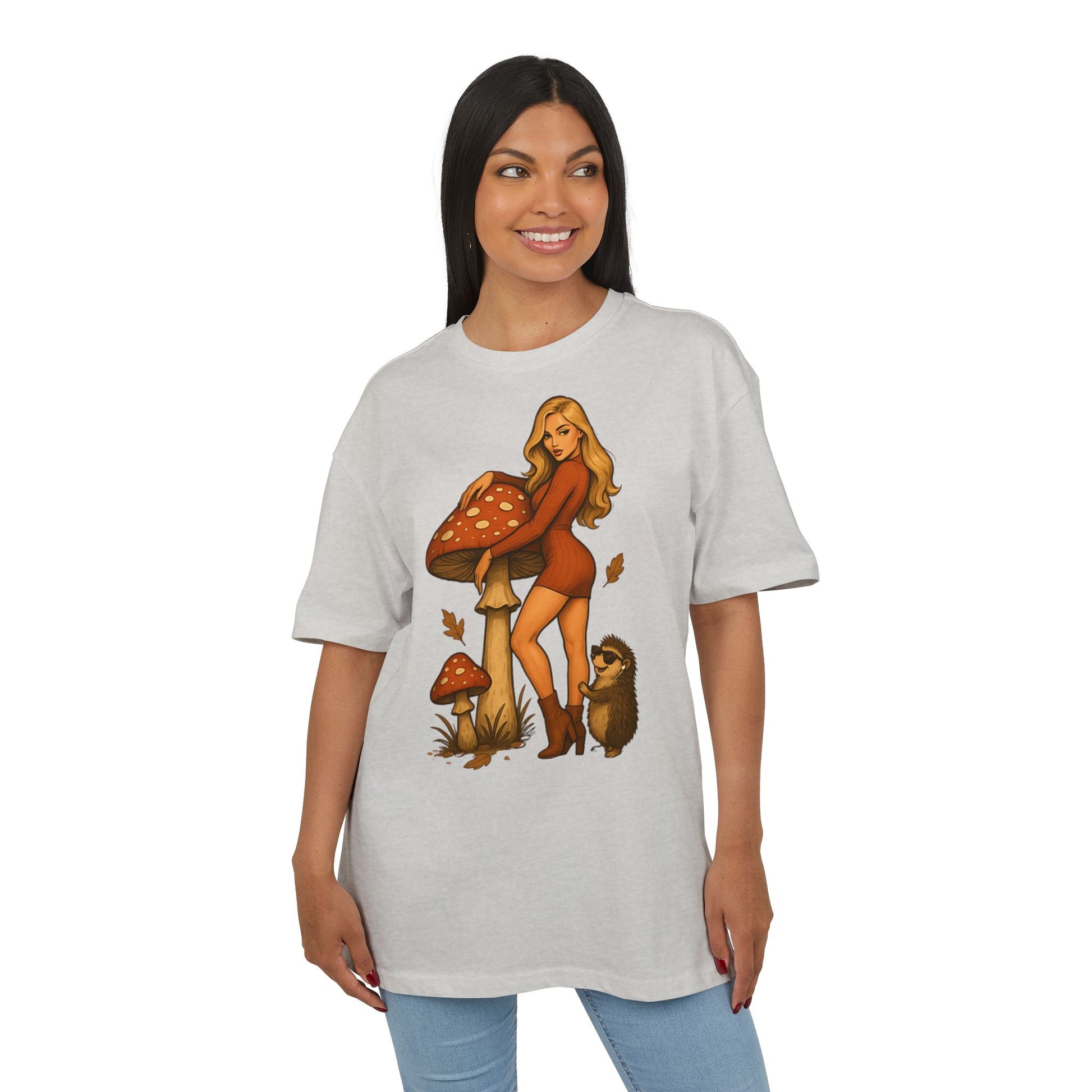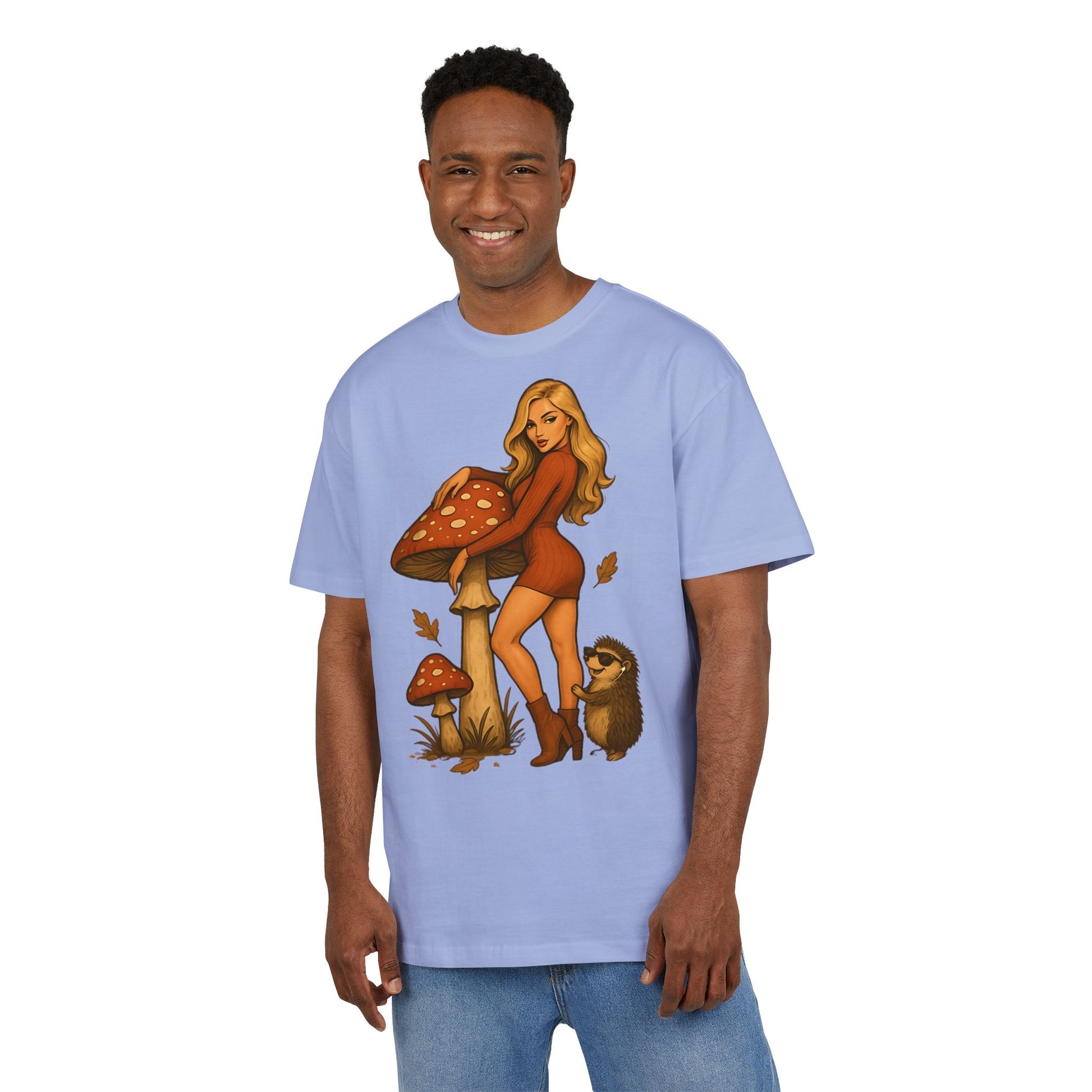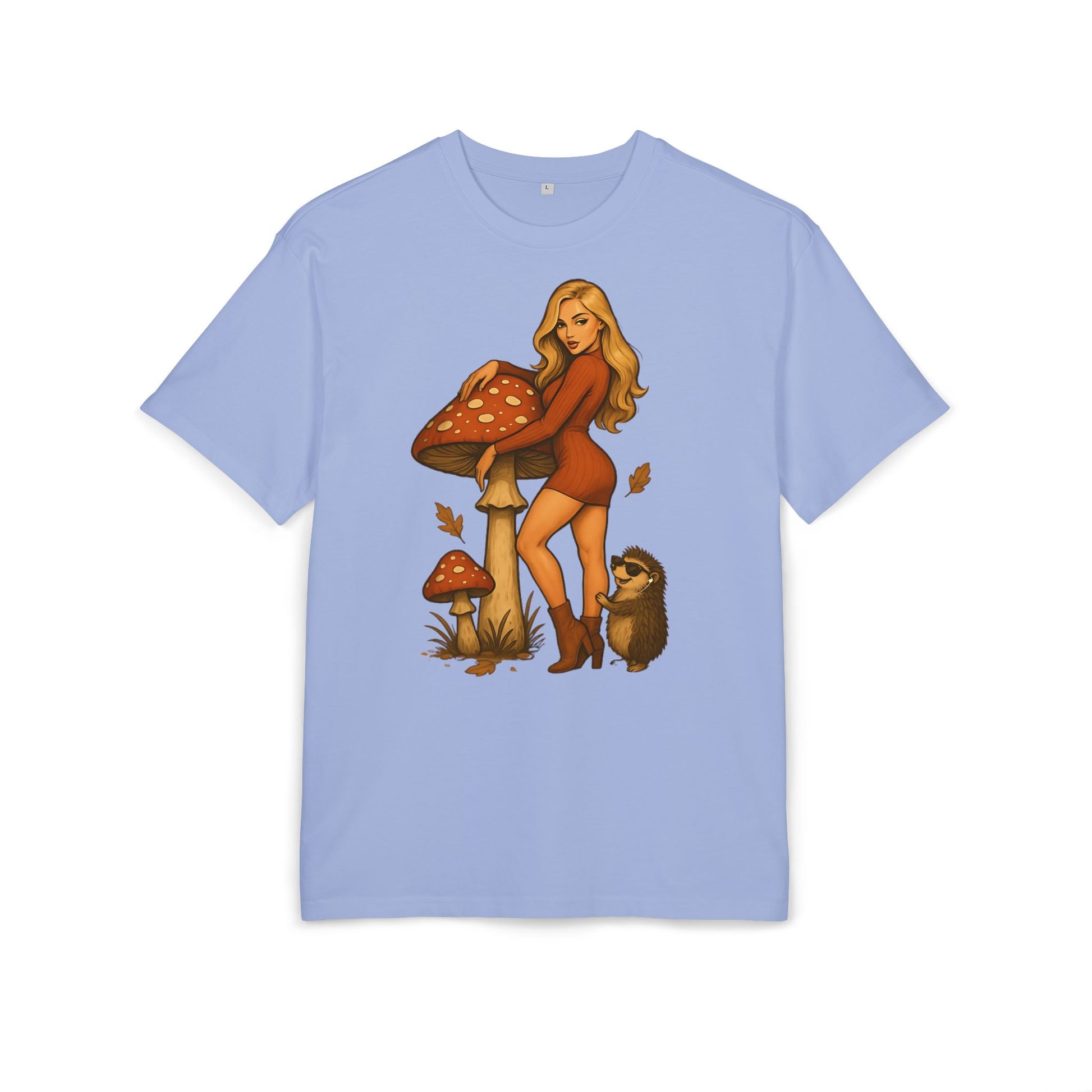 Vintage Pilz Fee & Igel Cartoon (Brustprint) – Retro Waldmotiv T-Shirt für Natur- & Pilzliebhaber